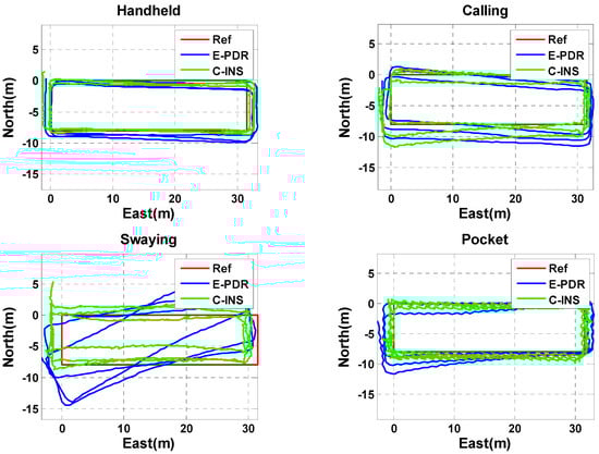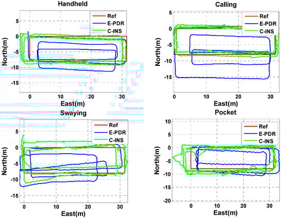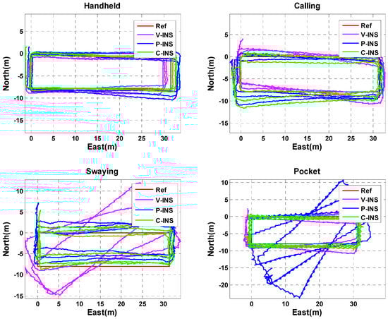 In this section, we analyze the navigation performance of the C-INS method in the four basic phone-motion modes described above. In [15,24,47], the pseudo-velocity from the gait model was employed for velocity updates to improve the INS velocity, and is called V-INS. In Ref. [48], the pseudo-position from E-PDR was used for position updates to improve INS position, and is called P-INS. In Figure 5, the red, magenta, blue, and green lines represent the reference trajectory, V-INS trajectory, P-INS trajectory, and C-INS trajectory, respectively. We can see from the figure that C-INS exhibits a robust position estimation performance in the four basic smartphone positions. V-INS suffered large position drift in the swaying position because the relative position between the smartphone and pedestrian’s body is always changing during one step period. The velocity of the smartphone is seriously inconsistent with the pedestrian’s walking speed, so the assumption of a velocity update is violated. The difference is that P-INS suffered a large position drift when the smartphone was put into a pocket, the reason is that the position calculated by the E-PDR alternately represents the position of the left and right feet. In other words, if the smartphone is put into the right pants pocket, the estimated position of E-PDR represents the position of the left leg when swinging the left leg.