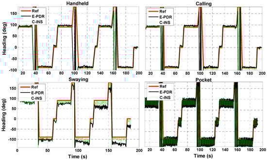 Heading of reference, E-PDR, and C-INS solutions for four different phone-holding positions.
