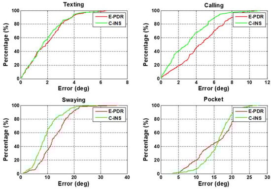 In this section, we analyze heading performance to illustrate that C-INS exhibits consistent navigation performance with the E-PDR method. Figure 6 shows the heading angle result with four phone-holding positions calculated using the C-INS and E-PDR solutions. The red, green, and black solid lines represent the reference heading, heading estimation result of the C-INS method, and the heading estimation result of the E-PDR method, respectively. The corresponding heading cumulative error percentages are shown in Figure 7. As Figure 6 and Figure 7 show, the C-INS and E-PDR methods have similar heading performance when the smartphone is held in a hand or placed in a pocket. Moreover, the C-INS method can provide a higher precision of heading estimation in the positions of calling and swaying, because the external periodic acceleration caused by human activity reduces the chances of the accelerometer being used to correct the horizontal angle. Unlike the E-PDR method, the C-INS method uses a gait model to provide the relative position displacement or moving velocity, which is independent of the external horizontal acceleration. This results in the C-INS method being able to obtain a better heading estimation. The statistical heading performance of both algorithms in four phone-holding positions are illustrated in Table 1. As can be seen from the table, the root-mean-square (RMS) heading errors of the E-PDR method for the four different phone-holding positions are 2.4°, 5.3°, 14.0°, and 16.6°, while those for the C-INS method are 2.3°, 3.9°, 10.9°, and 16.6°, respectively.