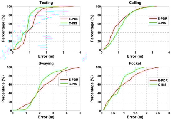 The position estimation results of the C-INS and E-PDR solutions in the experiment for the four basic phone-holding positions are shown in Figure 8. The red, green, and blue solid lines represent the reference trajectory, position result of the C-INS method, and position result of the E-PDR method, respectively. Figure 9 shows the position cumulative error percentages of the C-INS and E-PDR methods. As shown in Figure 8 and Figure 9, the position results calculated by the C-INS method have the same performance in the handheld, calling, and pocket positions, and even higher accuracy in the position of swaying, compared with the E-PDR method. The statistical positioning errors of both algorithms are illustrated in Table 2, the RMS position error of the E-PDR method for the four different positions (i.e., handheld, calling, swaying, and pocket) are 1.2, 1.2, 2.5, and 1.1 m, respectively, and those for the C-INS method are 0.9, 1.3, 2.2, and 0.9 m, respectively. Based on the same step model, the accuracy improvement of the heading angle cannot be completely reflected in the position error. Because the relative position of the phone and the human body is not fixed, the speed constraints and relative position constraints extracted from the step model sometimes do not conform to the actual situation.