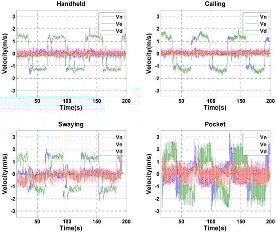 In addition to self-position estimation capability, the C-INS method can provide high-frequency position results (e.g., 50 Hz) that are the same as the data-sampling rate compared with the E-PDR solutions (i.e., 1–2 Hz). The high-frequency 3D velocity is also available for the C-INS method. As shown in Figure 11, the blue, green, and red solid lines represent the north, east, and down velocities, respectively. Figure 11 shows that the calculated velocity values are all at 1–2 m/s in the handheld, calling, and swaying positions, which are reasonable estimations for pedestrian walking velocity. In the pocket position, the velocity fluctuation is very large because each leg movement will cause a great acceleration of the smartphone. In this case, the average speed during a step circle is equal to the pedestrian’s walking speed.