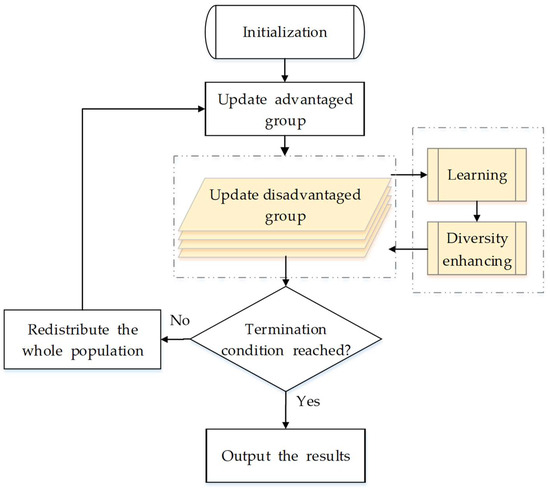 Algorithm 1 shows the detailed steps of updating the disadvantaged group, which is the core of our modification. Apart from Algorithm 1, another minor modification in the proposed algorithm is that all particles in the two groups should be redistributed according to their fitness at the end of each generation. particles with better fitness (for minimization problem, “better” means “smaller”) are distributed to the advantaged group, whereas others are distributed to the disadvantaged group. The overall framework and the detailed steps are shown in Figure 1 and Algorithm 2, respectively, where MaxFEs is the maximum number of function evaluations that represent the maximum computation cost.