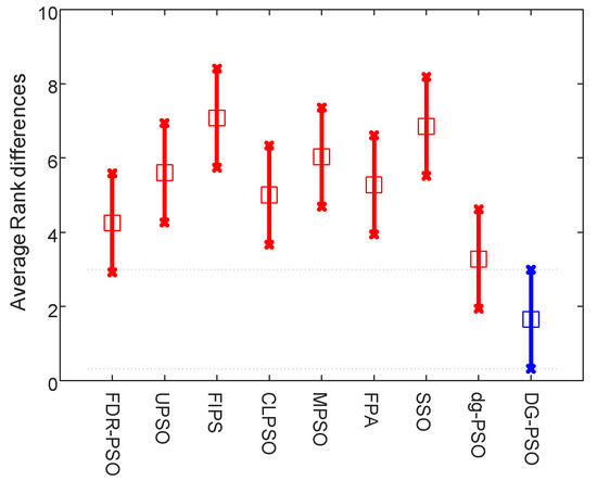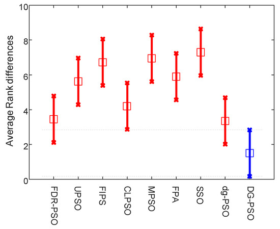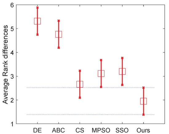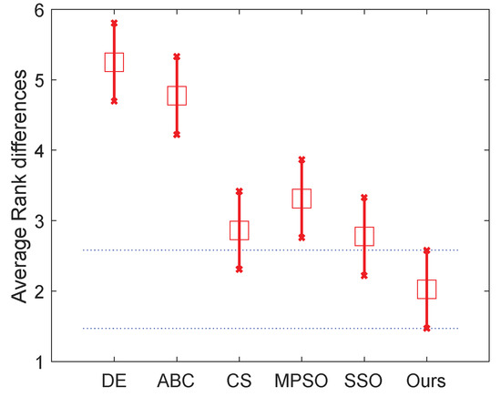 In detail, the mean fitness and the corresponding standard deviation are given in Table 7, where the best one in each case of the mean fitness is shown in bold. It is easy to find that our algorithm obtains the best results in all cases in terms of the mean fitness, except the case of 7-level thresholding (D = 7) of image C. To evaluate the effectiveness of our algorithm’s improvement over other ones, the involved algorithms are also ranked with the Friedman test. We conduct two tests that ranked the algorithms on the normal (D = 2, 3, 4 and 5) level and high level (The high level thresholding is popularly employed in multilevel thresholding [68,69]) (D = 7, 9, 15 and 20), respectively. Therefore, 40 variables are used in each comparison in each test, where is the number of images, denoted the number of levels, and denoted the number of used measures including the meant fitness and the corresponding standard deviation. The significance level is set to 0.05. Table 8 and the two figures (Figure 7 and Figure 8) present the numerical rankings and graphical results obtained by the test, where better performance is denoted by smaller ranks.