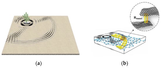 Concept of self-sensing UGWs: (a) UGWs, excited by a PZT wafer, propagating in a nano-engineered composite laminate; (b) Nano-NSS modulated by UGWs, triggering tunneling effect and leading to local change in electrical resistance.