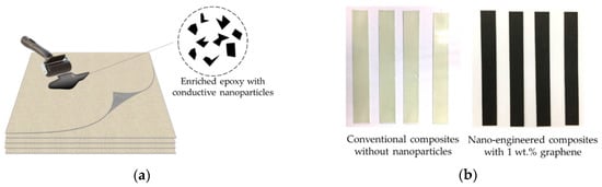 Nanoparticles which are dispersed in polymer matrices as reinforcement elements have now found their superb niches to functionalize conventional composites with new capabilities, as typified by electro-static discharge [1], electromagnetic interference shield [2], gas leakage sensing [3], UV-absorbing [4], flame-retardant coating [5] and damage detection [6,7], to name a few. In particular, the self-sensing using embedded nanoparticles has gained prominence in recent development of composites, to accommodate the increased desire from industry to acquire structural parameters and ambient information, not at the cost of introducing excessive weight and volume penalty to original composites due to the use of additional sensing systems—a paramount factor to be particularly considered for developing and implementing structural health monitoring (SHM) approaches in aerospace applications.