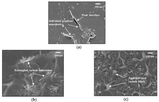 The morphology of dispersed nanoparticles in nanoparticle/epoxy hybrid was scrutinized with cryo-fractured cross sections of samples using a scanning electron microscopy (SEM) (JEOL Model JSM-6490). SEM images show that the 2D disk-like graphene-based nanoparticles are uniformly apart from each other (Figure 4a), while 1D rope-like carbon nanotube (CNT)-based and 0D sphere-like carbon black (CB)-based nanoparticles are entangled (Figure 4b) or agglomerated (Figure 4c). The macroscopic properties of nanoparticle-enriched composite laminates are substantially influenced by the morphological features of the nanoparticle/epoxy hybrid.