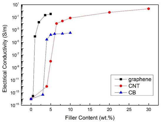 where σ signifies the electrical conductivity of the composites, p the volume fraction of nanoparticle, pc the percolation threshold of the composites, and exponential t a constant associated with the dimensionality of the conductive nanocomposites. Figure 5 shows the obtained relationship between the electrical conductivity in logarithmic scale and weight percentage of the nanofiller content, from which the percolation thresholds were estimated to be within 0.5–1 wt % for graphene/epoxy hybrid, 4–5 wt % for carbon nanotube/epoxy hybrid, and 4–6.5 wt % for carbon black/epoxy hybrid, respectively. The percolation results are well conformed to results from others’ works, which varied from 0.1 wt % to 8 wt % with different nanofillers [31,32,33,34]. At the threshold, a steep increase in electrical conductivity from nonconductive to conductive region can be observed. As commented earlier, a high sensitivity of Nano-NSS is assured when the nanofiller content is within the percolation region. Upon comparison, it is surmised that the 2D structure of graphene, compared with 1D rope-like carbon nanotube and 0D sphere-like carbon black, facilitates the formation of effective conductive electric paths (via tunneling effect) in the network while avoiding possible agglomeration or entanglement, endowing the hybrid with the lowest percolation threshold. Therefore, 2D disk-like graphene-based nanoparticles were selected as the functional nanofillers to form the dispersed and networked sensing system (gNano-NSS). Based on the morphological analysis and considering the suitable resistivity for further measurement and convenience in fabrication process, 1 wt % (approaching the percolation threshold) graphene was adopted for developing gNano-NSS.