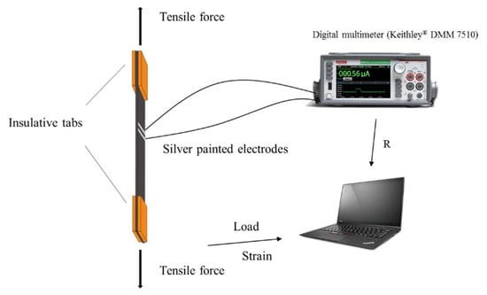 Composite laminates with dispersed gNano-NSS were fabricated, each measuring 1.4 mm thick, 25 mm wide and 200 mm long. Each sample was treated with a 20 mm long insulative tab at the end. Four samples of this kind were tested on a MTS tensile machine (Alliance RT/50) for measurement of mechanical and piezoresistive properties. During measurement, the sensing area on the surface of each sample is the region confined by a pair of silver electrodes with 1 mm gap. The gap was prudently determined and controlled to possess an electrical resistance that is compatible with that of the digital multimeter. Note that according to Equation (7), the static resistance will not influence the resistance changing ratio or sensitivity. The electrodes were connected to a dynamic digital multimeter (Keithley DMM 7510), as shown schematically in Figure 6.