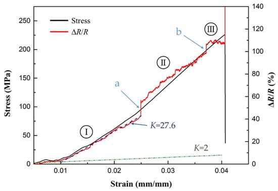 - the change in resistance experiences a steady increase with the strain (except at the beginning where stress curve is not linear due to the preloading of the machine). No major damage occurs at this stage and the gauge factor (K) is calculated based on a linear fitting of the measured strain from 1% to 2.5% (blue dash line in Figure 7) byThe obtained gauge factor of the gNano-NSS is ~14 times higher than that of conventional metal strain gauges (K = 2, green dash line in Figure 7). According to Equation (6), the gauge factor represents the sensitivity of gNano-NSS through resistance changing ratio with applied strains;