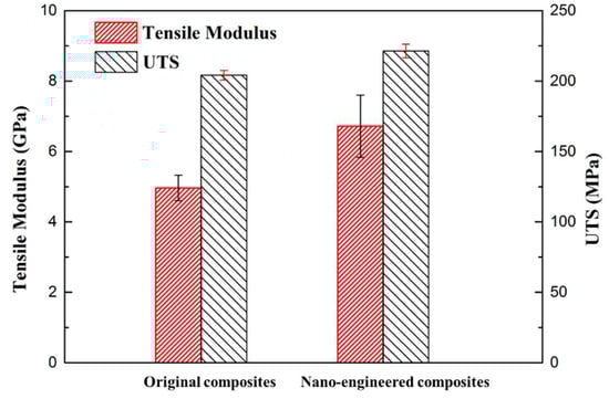 Even though only one “dispersed sensor” of the gNano-NSS in the composite was tested, the resistance change can still give rich information about damage occurrence and development not just at sensing area between electrodes but also within the whole structure, unlike the surface-attached strain gauges which only reflect the monitored location strain status. The gNano-NSS features a gauge factor as high as 27.6, compared with a gauge factor of 2 offered by a standard metal strain gauge. Furthermore, the results of mechanical properties exhibit that with inclusion of graphene particles the elastic tensile modulus and ultimate tensile strength (UTS) of composites have been improved 35% and 8%, respectively (see Figure 8). The results are higher than in some previous works [38] (15% and −6%, respectively) mainly due to the exclusion of solvents in dispersion methods, which would degrade the crosslink strength of epoxy resin.