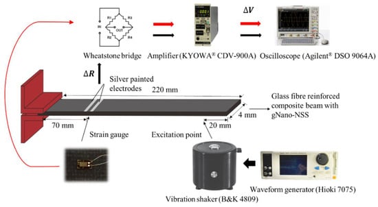 A cantilever beam made from the above nano-engineered composites, 1.4 mm thick, 220 mm long and 4 mm wide, was fabricated and fixed at one end (Figure 9). An electromagnetic shaker (B&K 4809) was used to introduce a point-like excitation to the beam, 20 mm from the free end. As in the above tensile test, “dispersed” sensing was implemented by painting silver electrodes on the beam surface at 70 mm from the fixed end. The gap was selected and controlled to possess an electrical resistance that is compatible with that of the Wheatstone bridge in the signal amplifier. Since the surface tension and compression strain correlates to the deflection of the monitored beam section, measuring the change in resistance of the local gNano-NSS provides information of the mode shapes under any vibration frequency. For calibration, a conventional metal strain gauge (fence length 5 mm) was pasted on the opposite side of the painted electrodes. During the vibration test, the sensing point and strain gauge were subjected to inverse strain changing, thus the signals captured feature a phase difference of π. To capture stable and strong signals under the relatively small strain level of beam subject to vibration loads, a commercial signal amplifier (KYOWA® CDV-900A) with a Wheatstone bridge was used to process signals from both the strain gauge and cable-extracted local gNano-NSS before being outputted to and collected by an oscilloscope (Agilent® DSO 9064A). The sensing performance was examined from 5 Hz to 20 kHz by sinusoidal excitation from a waveform generator (Hioki 7075). The metal strain gauge was used to calibrate the sensing capability of the gNano-NSS with excitation frequency lower than 2 kHz because metal strain gauge failed to respond to dynamic vibration of higher frequency.