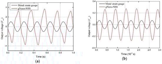 Vibration signals of metal strain gauge and gNano-NSS at (a) 5 Hz and (b) 2 kHz.