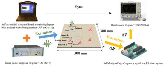 A 300 mm × 300 mm 8-layer composite laminate plate (1.4 mm thick) with the gNano-NSS was fabricated to test the capability of sensing ultrasonic waves. A piezoelectric lead zirconate titanate (PZT) actuator (Haiying Enterprise Group Co., Ltd., Wuxi, China, P-51, 12 mm in diameter, 1 mm in thickness) was mounted on the surface of the laminate to excite probing ultrasonic signals with a self-developed SHM system. The system consists of UGW generation module comprising of an NI PXI-5412 arbitrary waveform generator (AWG) and a linear power amplifier (Ciprian® US-TXP-3). The system generates tailor-made probing guided waves in narrow-band waveforms at an arbitrary frequency in the range of 0–2.5 MHz. The AWG-generated probing UGW signals were amplified by the linear power amplifier before being applied on the actuator. As illustrated in Figure 11, multiple locations of the structure were arbitrarily selected as “dispersed sensors” to measure the resistance change with ultrasonic wave propagating through the samples. To obtain strong and stable signals, a dedicated high-frequency signal amplification system was designed and developed, comprising of an electronic amplifier circuit, and a series of filters. The Wheatstone bridge was rebuilt with an adjustable balance resistor which greatly facilitated the electrodes painting process, unlike the fixed 120 Ω and 350 Ω in commercial bridges that require careful gap control of electrodes. The change in local electrical resistivity was then transferred into voltage signals and collected via an oscilloscope (Agilent® DSO 9064A). To verify the sensing performance, the excitation UGW signals were varied from 50 kHz to 440 kHz and captured signals were compared with PZT sensors attached nearby, for example sensor I-I and I-II around sensing point I in Figure 11.