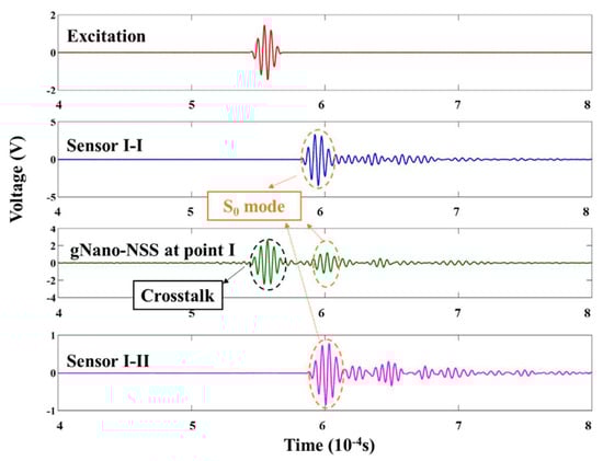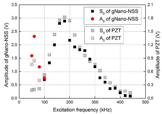 As some representative results, the captured signals of gNano-NSS at point I with excitation frequency of 180 kHz is demonstrated in the time domain in Figure 12. It can be clearly observed that the first-arrival wave component (viz., the zeroth-order symmetric Lamb wave mode guided by the laminate, denoted by S0 hereinafter) of the local gNano-NSS has good agreement with the signals of PZT sensors in term of the arrival time. The obvious extra part of the acquired signal is the crosstalk noise at the initial moment of excitation which comes from the high voltage signal generation system. Figure 13 shows the amplitude change with the frequency. The captured signals of the gNano-NSS have similar trend with conventional PZT sensors in both S0 and A0 (The zeroth-order anti-symmetric Lamb wave mode, denoted by A0 hereinafter) modes, although with a slight difference in the magnitude due to the different couple effect in sensing mechanisms discussed earlier. However, because the crosstalk noise is broad enough to cover nearby signals at low frequency, some data points of S0 wave are missing in Figure 13.