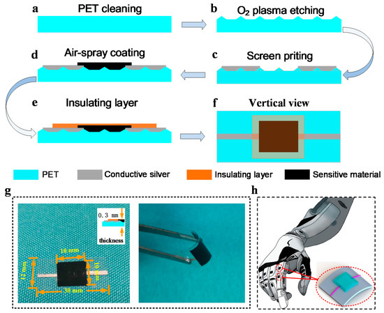 Fabrication process of the temperature sensors: (a) polyethylene terephthalate (PET) cleaning with acetone, alcohol and deionized (DI) water; (b) O2 plasma etching; (c) printing two conductive thin wires; (d) the fabrication of sensitive layer using air-spray coating; (e) the fabrication process of insulating layer; (f) the vertical view of the temperature sensor; (g) the diagram on the left is a dimensional view of the sensor, including the size of the sensitive area, the overall size and the thickness. The diagram on the left shows the good flexibility of the sensor; (h) One of the possible applications of the temperature sensor.
