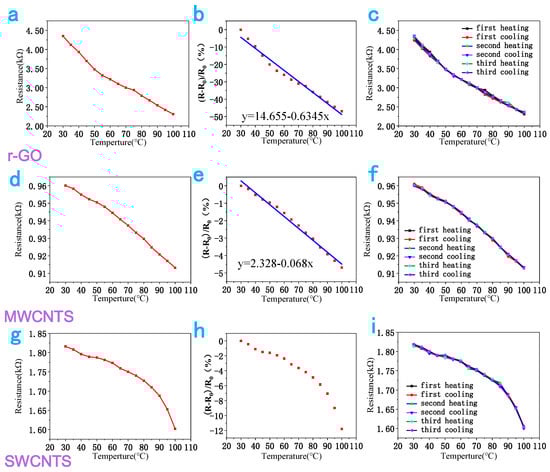 To test the performance of the three temperature sensors, the resistance change was measured using a digital multimeter (UNI-T UT61) during a change in temperature from 30 °C to 100 °C. The resistance change was recorded with each measurement step of 5 °C, and the temperature was maintained at each step of 5 degrees Celsius for 5 min to observe the change in resistance. Figure 2 shows the representative experimental characterizations of the temperature sensors, whose sensitive material is the r-GO, MWCNTS and SWCNTS, respectively. Figure 2a,d,g illustrates the resistance change with the temperature for the three different temperature sensors. It clearly indicates that the curves of the graphene and MWCNTS temperature sensors are closer to linear, which is more suitable for a temperature sensor. The temperature coefficient of the resistance (TCR) is often used to describe the temperature-sensitive properties popularly known as sensitivity [20]:
