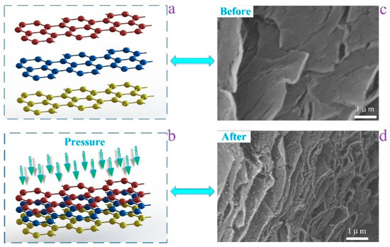 Layered structure model and SEM of r-GO: (a) schematic showing the layered structure model before pressure; (b) schematic illustrating the layered structure after pressure; (c) SEM image of the r-GO before pressure; (d) SEM image of the r-GO after pressure.