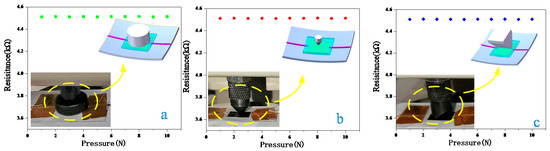 The relationship between the resistance of the temperature sensor and the applied pressure. The inset is a field photograph of the pressure test and a schematic diagram of the application of pressure on the sensitive area: (a) the resistance change when applying pressure to the whole sensitive area of the sensor, from 1 N to 10 N; (b) the resistance change when applying pressure only on a point, from 1 N to 10 N; (c) the resistance change when applying pressure on a strip area by a wedge, from 1 N to 10 N.