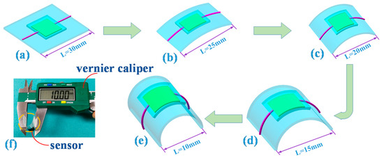 The length of the long side of the sensor (L) and bending schematic diagram of the temperature sensor: (a) L = 30 mm; (b) L = 25 mm; (c) L = 20 mm; (d) L = 15 mm; (e) L = 10 mm; (f) the way to control the bending.