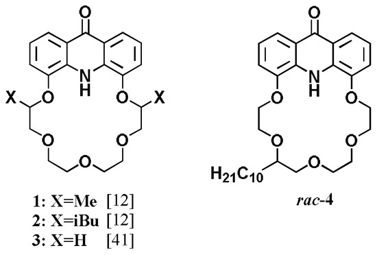 Chemical sensors offer the opportunity for an easy, fast, and selective analysis of a single chemical species. In the perspective of the above applications, the development of new chemical sensors is still relevant today. Piroxicam, pyrophosphate, amide, carboxamide, benzoic acid, sulfide derivatives [14,15,16,17,18,19,20,21,22,23,24] and different types of supramolecular recognition agents (porphyrins, calixarenes, etc.) [25,26,27,28,29] have been efficiently used in several cases as electroactive sensing materials in lead detection. The largest number of lead-selective ionophores found in the literature belongs to the family of crown ethers [30,31,32,33,34,35,36,37,38,39,40]. In previous studies, acridono-crown ether derivatives (1, 2 and 3, see Figure 1) were found to be highly selective for lead(II) ions due to the presence of a rigid, heteroaromatic tricyclic ring [12,41]. We were motivated to synthesize a new, lead-selective acridono-crown ether-type neutral ionophore, which could be incorporated into a polyvinyl chloride (PVC)-based membrane of a potentiometric electrode. In order to increase the lipophilicity and simultaneously the solubility of the ionophore in the PVC membrane [42,43], a decyl chain was incorporated into the macroring (see rac-4 in Figure 1).