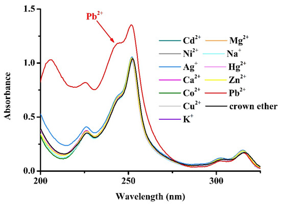 Due to the presence of the chromophore acridone unit, the complexing ability of the ionophore rac-4 could be studied using UV-Vis spectroscopy by adding different metal salts in a molar ratio of 10:1 to the solution of the ligand. As shown in Figure 2, the ionophore rac-4 shows an increased absorbance only in the presence of lead(II) ions. The selectivity of macrocycle 3 (see Figure 1) toward various metal ions had been previously studied with the same method under the same conditions, and lead(II) ion selectivity was observed [41]. It can be concluded that the complex formation was not influenced by the introduction of the decyl group into the macroring of the parent crown ether 3 (Figure 2).