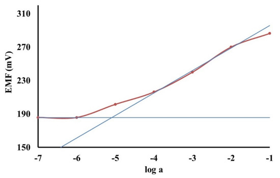 The electrode was calibrated in different concentrations of lead(II) acetate solutions. The calibration curve is shown in Figure 3. The lower detection limit was determined according to the definition [48]. To the linear range of the calibration curve (marked with a red line in Figure 3), a linear regression line (marked with a blue line in Figure 3) was fitted. The coefficient of determination (R2) was over 0.99. The ordinate value of the intersection of the regression line and the constant potential (marked with a horizontal blue line in Figure 3) is the detection limit.
