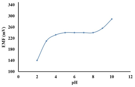 Effect of pH on cell potential using the electrode membrane containing o-NPOE plasticizer and two equivalents of lipophilic ion-exchanger, measured in aqueous lead(II) ion solution (10−3 M).