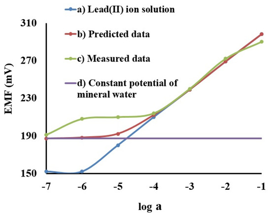 The chosen test sample was mineral water, which reportedly contained the following ions at these concentrations: Na+ (19 mg/L), Mg2+ (23 mg/L), and Ca2+ (59 mg/L). The mentioned concentrations are about 10−3 M, which concur with the functional concentration range of the electrode. During the experiment, lead(II) ion was added to the mineral water in different concentrations, and changes in the EMF were recorded. The results are shown in Figure 6, “Measured data”, curve (c). Curve (a) shows the calibration curve in the aqueous solution of lead, while line (d) indicates the potential response of the mineral water. The deviation was below ±0.5 mV in all of the cases.