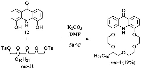 The macrocyclization of acridine-4,5-diol (12) and the ditosylate rac-11 in the presence of a weak base, potassium carbonate in N,N-dimethylformamide (DMF), resulted in the macrocycle rac-4 (see in Scheme 2).