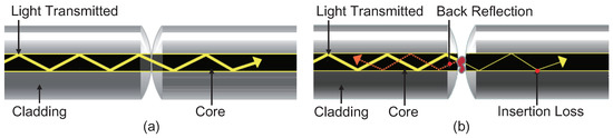 The presence of dirt, debris, or defects within the fiber core causes not only a loss of signal power (called attenuation or insertion loss) but also a portion of the optical power, which reflects back upstream to the light source (called back reflection), as shown in Figure 2. Both insertion loss and back reflection can have a negative effect on system performance, and defects in either connector will affect the performance of the mated connection [3]. Moreover, they may even permanently damage the connectors and result in irreversible destruction. Therefore, inspecting connector end faces is necessary for providing a reliable, high-performance fiber optic transmission before connecting a new optical fiber into the transmission system.