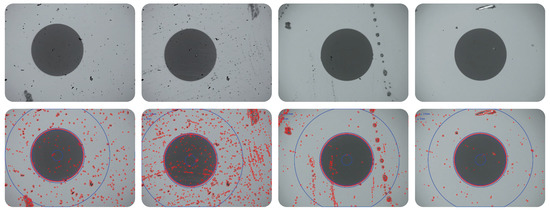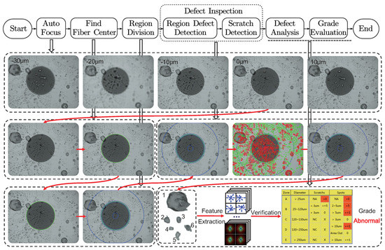 - As far as we know, this is the first time that complete defect detection algorithms for optical fiber end faces are available in the literature. Many device manufacturers introduce the function but do not illustrate how to implement the detection algorithm, which is the core of the inspection process [7,8]. As for the relevant patents, they are usually very abstract, and only general frameworks are introduced, without specific implementation strategies or algorithm parameters. We also present the quality assessment procedures used in our automatic optical inspection (AOI) equipment, as stated in Section 2.