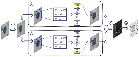 Architecture of the DO2MR filter approach, which is designed mainly for the region-based defects. It includes ① image preprocessing, ② maximum filtering, ③ minimum filtering, ④ residual generation, and ⑤ threshold segmentation steps.
