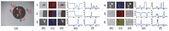 where refers to the difference of the signal values in interval , and denotes the metric function. By using , the metric indicator can be expressed as . Please note that the expression of is quite similar to the partial derivative of the signal , but they are different. The difference between the maximum and minimum value in the neighborhood in is helpful to exhibit weak burrs and defects. Taking the optical fiber connector end face image with pits and chips in Figure 7 as an example, we randomly select six regions of interest (ROIs) and extract a one-dimensional signal (the red line in Figure 7d) in each region. As shown in Figure 7e for these signals, it can be seen that they have different characteristics and therefore have good representativeness. In Figure 7f, residual plots obtained by the min-max ranking method are presented. Regions with mutations or burrs in the original signals are well highlighted, e.g., Signal 1 and 5 in Figure 7f.