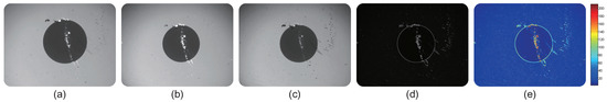 Processes exhibiting performance of the min-max ranking filtering approach on an optical fiber image (two-dimensional). From left to right: (a) the raw defective image, (b) result of the maximum filtering process, (c) result of the minimum filtering process, (d) difference of the maximum and minimum filtering processes, and (e) the corresponding heat map image (best viewed in color).