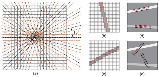 as the scratch strength at with angle , where and denote the average gray level corresponding to the red and gray branches, centered on the pixel , with angle and edge length equal to l. Scratch strength is large if the filter is aligned within a scratch; otherwise, the filter is crossed and the scratch strength is lower, as shown in Figure 9d,e. This specially designed detector accumulates the contrast between the pixel in scratches and the surrounding pixels along the filter direction, so it allows us to discriminate scratches from flat background pixels easily. Usually, the length l and interval between the red and gray lines in the filter are not fixed. They can be adjusted according to specific needs. In addition, the linear detectors at different orientations are not obtained by interpolation generally, but the pixels to be operated are found by rounding the coordinates of the points on the ideal line [19], as shown in Figure 9b,c (this operation is conducted mainly to reduce the computational complexity).