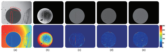 where and denote the results after the maximum and minimum filtering processes, refers to the corresponding residual map, as shown in Phase ④ in Figure 6. In Figure 8, processes exhibiting performance of the min-max ranking filtering approach on an optical fiber image are presented. From the residual result in Figure 8d and the heat map image in Figure 8e, it can be seen that even tiny defects can also be captured with the proposed DO2MR model.