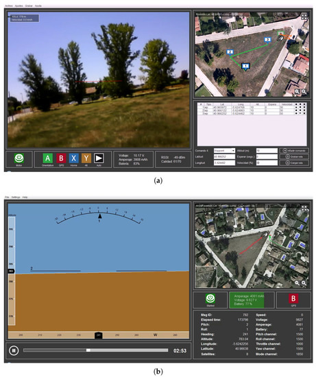 All the information transmitted can be recorded and stored by both, the control station used by the pilot and on the control platform (in this latter case it is mandatory). This information is recorded securely and encrypted, in JSON format, and allows viewing all telemetry received from the developed third-party software, in this case only to “play” the JSON file as if it were a video, where all the information is presented on an interface that is very similar to that of the flight in real time. Figure 2b shows a screenshot showing the status of all parameters, at a certain time of a past flight.