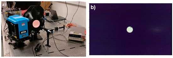 (a) The measurement setup for spectral response characterisation. Broadband light from a supercontinuum laser source (background) is directed to a monochromator (left) via an optical fibre. Resultant monochromatic light is fed to an integrating sphere, where a photodiode is used to monitor the light intensity. ASD FieldSpec pro is also used to monitor the output port (the optics and optical fibre visible in front of the sphere) (b) A FPI image of the integrating sphere port acquired in the calibration.