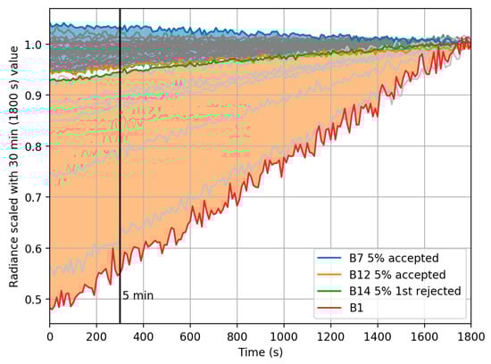 Time dependency of FPI camera radiance during 30 min. All data scaled with radiance at 30 min. Areas for accepted and rejected bands with 5% criteria between 5 min and 30 min are shown blue (accepted) and orange (rejected). Bands 7 and 12 are still accepted, bands 14 and 1 show the deviation of rejected bands.