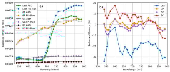 (a) Radiance spectra of reference panels BC, GC, GP and leaf measured with FPI camera based on manufacturer’s calibration (FPI-Man) and measured with ASD spectrometer. ASD spectra has been integrated to match FPI camera spectral responses. (b) Percentage difference between ASD and FPI Lman radiance. Stable FPI bands only.