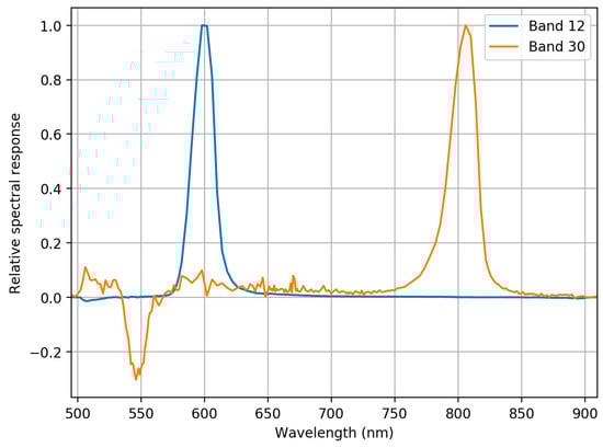 Example of full spectral response curves for bands 12 ( = 599.24 nm, FWHM = 19.82 nm) and 30 ( = 804.14 nm, FWHM = 25.13 nm). Curves are scaled so that the maximum value is 1.