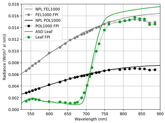 Original radiance spectra and same spectra integrated with FPI spectral responses. NPL FEL1000 and NPL POL1000: reference spectra provided by NPL; FEL1000 FPI and POL1000 FPI: corresponding spectra sampled using the FPI camera spectral responses; ASD Leaf: leaf radiance spectra measured using the ASD at the FGI’s laboratory; Leaf FPI: the ASD spectra sampled using the FPI-camera spectral responses. Leaf FPI is same as Leaf ASD line in Figure 7a.