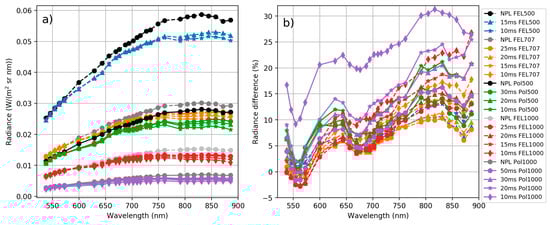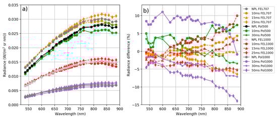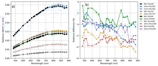 (a) Panel radiances based on manufacturer’s calibration. All FPI camera integration times, both lamps and all lamp distances, and NPL reference radiance for all lamp distances. (b) Manufacturer’s radiance LMan percentage difference to NPL reference radiance LNPL_ref. Values are given at centre wavelengths of the FPI camera channels.