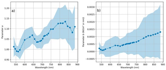 Band wise linear model parameters (a) a and (b) b to adjust Lman radiance using Equation (6). Parameters solved using 11 data sets. Light blue colour indicates 95% confidence interval for parameters from least squares calculations.
