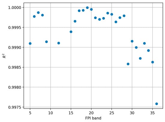 Linearity of the sensor response to various radiance levels was evaluated using five radiance levels of Polaron and FEL lamps. 10 ms integration time was the only one commonly used with all five radiance levels. Radiances provided by NPL and integrated to FPI sensor response were used as reference and compared to adjusted sensor radiance LNew based on Equation (4). Linear model was fit between the radiances and R2 values were calculated independently for each band.