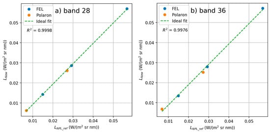 Linearity plots for (a) band 28 ( = 761.2 nm) and (b) band 36 ( = 885.9 nm).