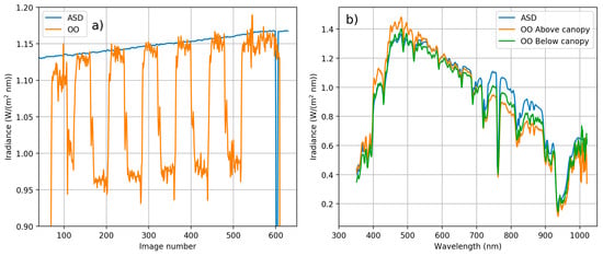 (a) Mean value of 600–700 nm irradiance spectra of the ASD and Ocean Optics (OO) for each FPI image acquisition time during the campaign. Irradiance increases toward the end of the flight due to rising solar angle. The steps in OO data are caused by UAV flying in different directions and thus the UAV and irradiance sensor tilting. (b) Effect of tree canopy to the irradiance spectrum. ASD is affected by the proximity of the tree canopies compared to the OO which is above canopy.