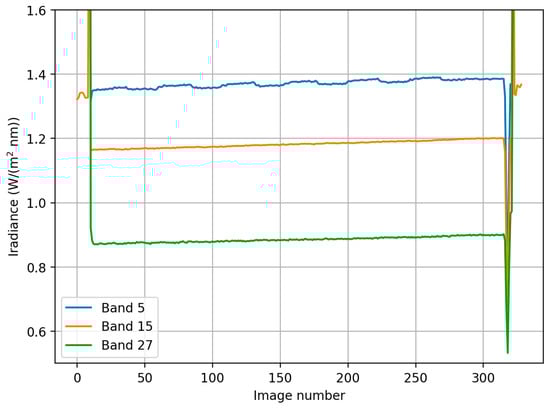 Corrected OOcor irradiance during the flight for blue (band 5, = 537.2 nm), orange (band 15, = 628.6 nm) and NIR (band 27, = 748.8 nm) range bands.