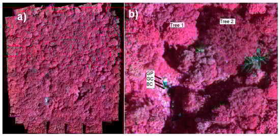 (a) False-colour reflectance mosaic of vertical flight f1 with FPI green, red and NIR range bands; (b) Part of the point cloud coloured with the spectral data, including locations of reference panels and measured trees.