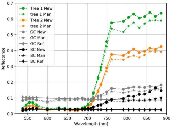 We used the reference panels BC and GC with nominal reflectance of 0.03 and 0.09 to evaluate the radiometric quality of calibrated image mosaics (Figure 19); brightest panel GP was excluded from analysis because it was saturated in many bands. In addition, reflectance spectra of two trees were measured from image mosaics. We used only the stable bands in this analysis (Section 3.1). The impact of surrounding vegetation could be observed in the panel spectra. In the NIR range, the background radiance due to the vegetation raised the level of incident irradiance and this could be seen in the panels’ reflectance spectra as increasing reflectance values. In the green and red spectral ranges, the surrounding trees were blocking the diffuse light that reduced the incident irradiance; this could be observed as reduced reflectance level of the panels in this range. In the NIR range, the panel reflectance collected from the hyperspectral image mosaic exceeded many times the reference values; in the green and red ranges they were closer to the reference spectra; at wavelengths less than 680 nm, the RMSEs were approximately 7.6% and 7.7% for the manufacturers’ and NPL calibration, respectively. Overall, the reflectance measured from the mosaic with NPL calibration appeared slightly higher than expected level; the values with the manufacturer calibration were closer to expected level.